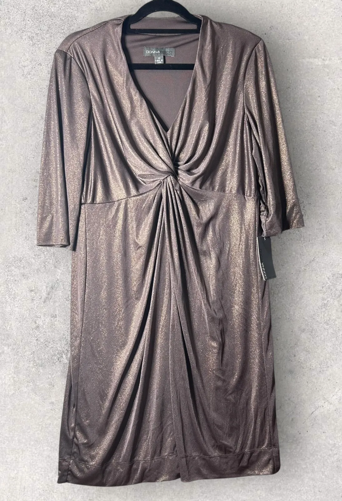 **Read condition below** Dress Length: Midi Color: Gold, Metallic (Looks like Gold metallic over a brown/mauve color) Sleeve Length: 3/4 Sleeve Occasion: Party/Cocktail, Formal Material: Polyester, Spandex Neckline: V-Neck Season: Fall, Winter, Spring, Summer Condition: New w/Tag - See back of dress, middle seam - small area on the right side where small area of thread is loose. No hole or coming apart but first layer of thread maybe missing. See closeup in pic. Price has been adjusted accordingly. Keywords: Donna Ricco dress, gold dress, metallic dress, midi dress, twist front dress, party dress, cocktail dress, formal dress, size 14 dress, women's dress, evening dress, special occasion dress, gold midi dress, metallic midi dress, new with tags **Fast Shipping / Smoke Free Home**