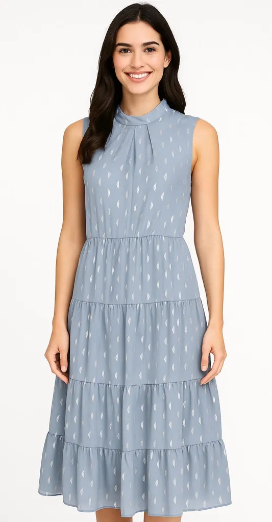 ❤️🔥OPEN TO OFFERS❤️🔥 Elegant Donna Ricco New York women’s sleeveless midi dress in a soft blue tone with silver metallic moon print throughout. Features a round neckline with pleated front detail, back button closure, tiered skirt, and full lining for comfort. • Size: Women’s 4 • Material: 100% Polyester • RN: 146964 • Color: Blue with silver metallic pattern • Length: Midi • Closure: Back button & hidden zipper • Condition: Pre-owned, in very good condition, no major flaws. ✨ Please refer to photos for measurements. Hashtags: #DonnaRicco #MidiDress #BlueDress #SpecialOccasion #CocktailDress #EveningStyle