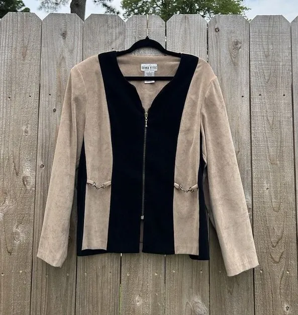 donna ricco sport vintage zip up jacket size 16. Preowned good condition, some wear on metal detailing. Tan and black in color, well fitted, great going out jacket! 97% polyester 3% spandex. 22 in pit to pit, 25.5 in top to bottom. Ships in 1-4 days š¬