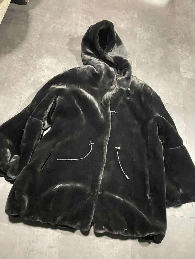 This is a Donna Salyers' Fabulous Furs coat for women in size XL. It is made of thick faux fur with a fur hood and lined with acetate. The coat is 30" long with long sleeves and a hook & loop closure. It is designed for winter wear and features pockets, breathable fabric, and a solid black color. Perfect for various occasions from casual to formal, including travel and business settings.