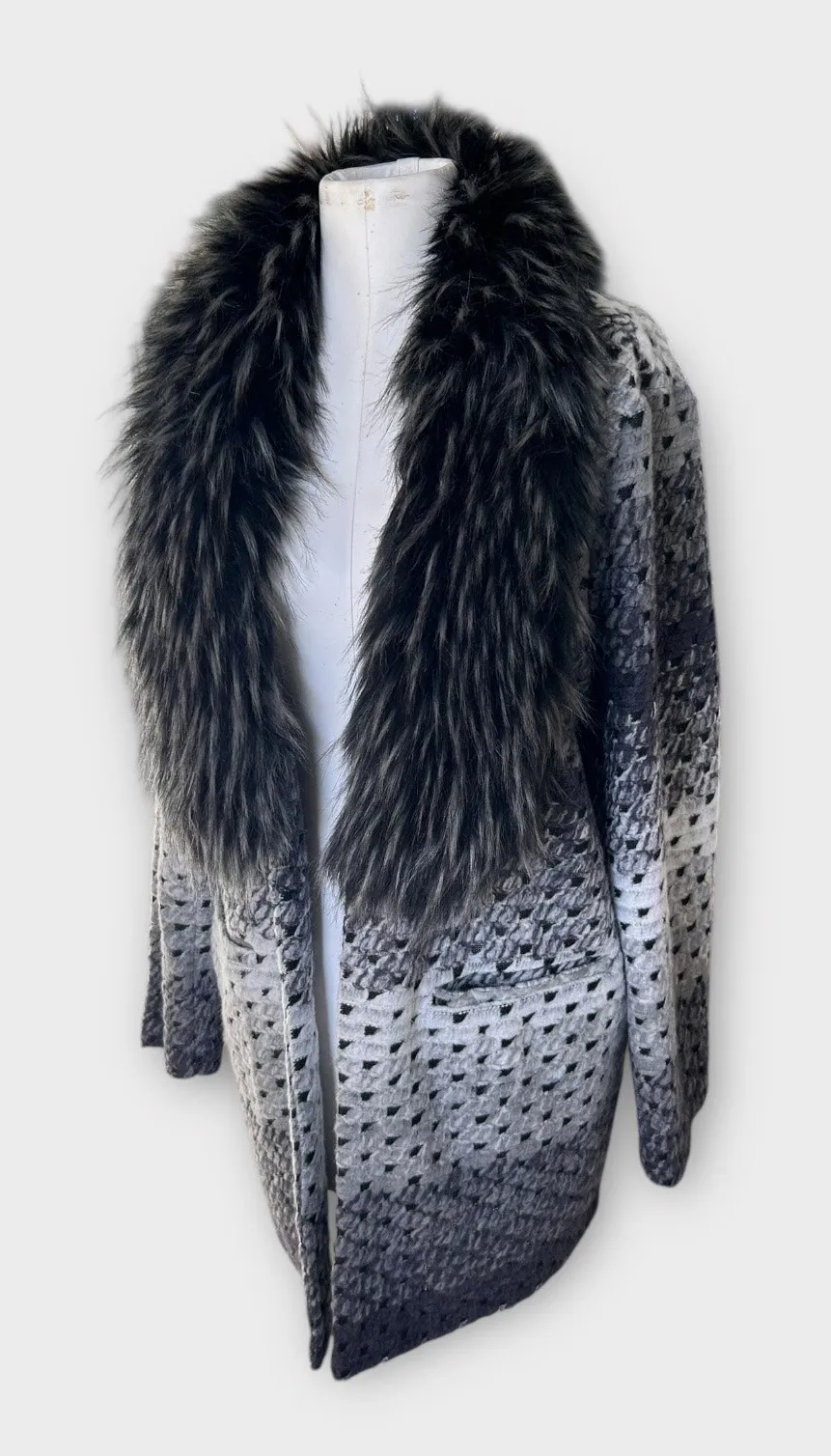 Luxurious statement cardigan coat by Donna Salyers Fabulous Furs, known for premium faux fur designs. This open-front knit coat features an ultra-plush faux fur shawl collar and a textured gray-to-black patterned body for an elevated, cozy look that dresses up or down beautifully. Details: • Brand: Donna Salyers Fabulous Furs • Size: XL • Color: Gray / Black • Style: Open-front cardigan coat • Collar: Plush faux fur shawl collar • Fabric: Knit body with faux fur trim • Lined: No (comfortable sweater-style coat) Fabric Content (per tag): • Body: 70% Acrylic, 30% Polyester • Faux Fur Trim: 100% Acrylic pile • Trim Lining: 100% Polyester Condition: Excellent pre-owned condition. Faux fur is full and soft with no matting. No flaws noted. Please see photos for close-ups and tag details. faux fur cardigan, Donna Salyers coat, luxury faux fur, cozy chic, open front sweater coat, winter layering, boho glam, boutique style, soft knit coat, statement outerwear Hollywood Glam