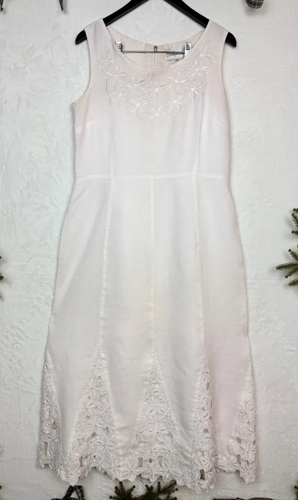 Donnavincy Elegant white sleeveless dress featuring delicate floral embroidery. Perfect for any occasion dress in good condition stitches on both waist sides can easily be removed.