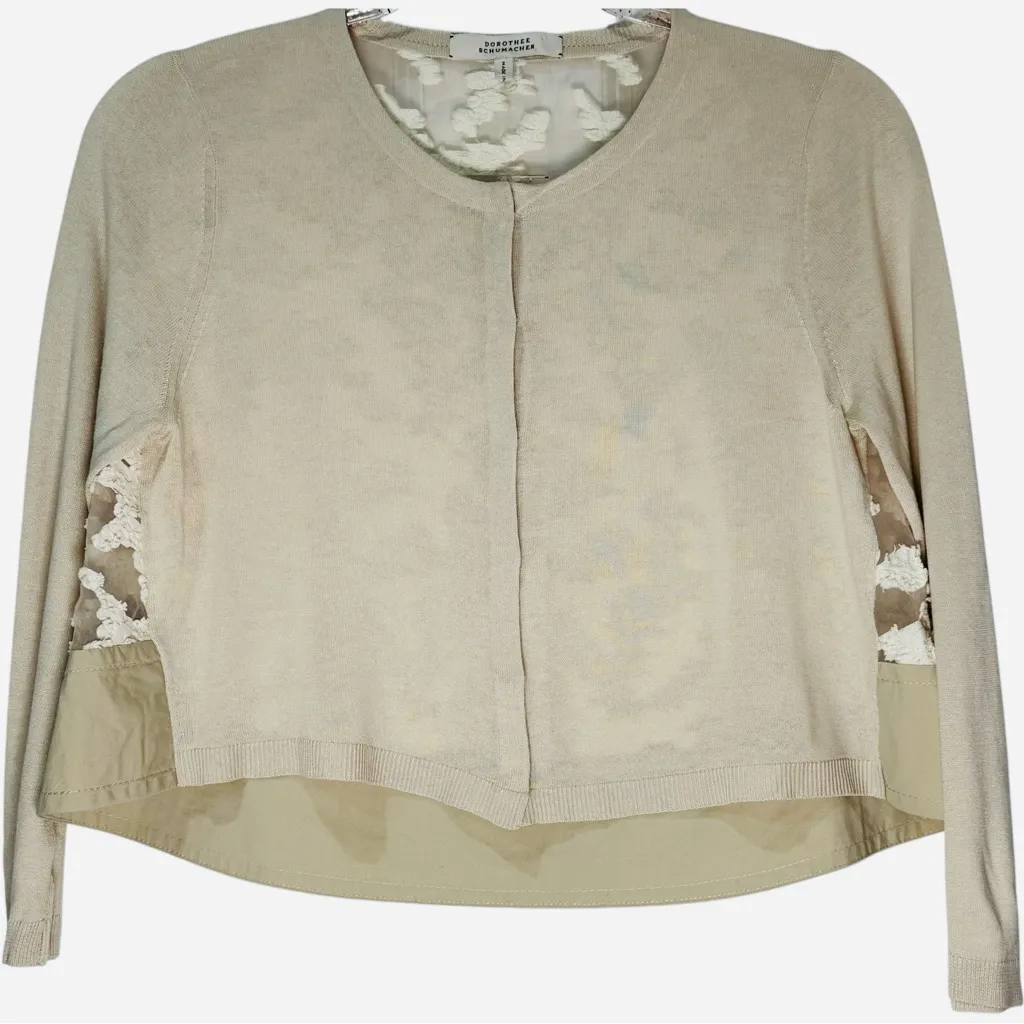 Luxurious Dorothee Schumacher cropped cardigan jacket crafted in a cashmere & silk blend with an elegant minimalist front and a stunning sheer lace back panel. Features a soft neutral tone, hook-and-eye front closure, and refined tailoring with a modern boxy silhouette. An elevated designer layering piece that transitions effortlessly from day to evening. Measurements (flat): • Chest: 18” • Length: 16” Condition: Gently preloved. There a few worn spots on the back sheer panel (see close-up photos); does not detract from overall wearability. Fabric and size tags have been removed. ⭐️⭐️Trusted seller, non-smoking home, fast shipping⭐️⭐️