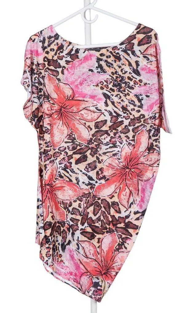 Size: Womens L Measurements are approximate and taken flat. Underarm to Underarm 19 in Top Length at longest point 35 in There are no stains, tears, or rips. Please see the pictures. All pictures are of the actual item. Colors may vary slightly due to camera limitations and monitor settings. • 95% Polyester, 5% Spandex • Machine Wash Pre-Owned Good