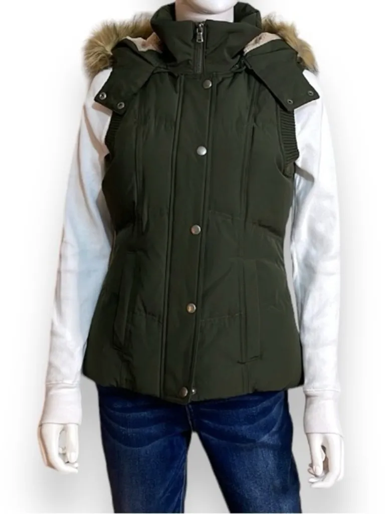G.H. Bass Duck Down Puffer Vest Deep Army Green Detachable Faux Fur Hood Women’s Size XS This is a... Show more