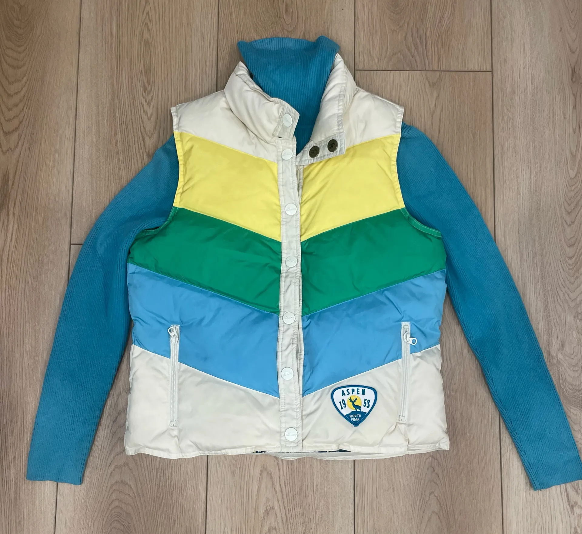 Old Navy Aspen Ski Down Puffer Vest, including matching blue turtleneck. Size medium Chevron pattern... Show more