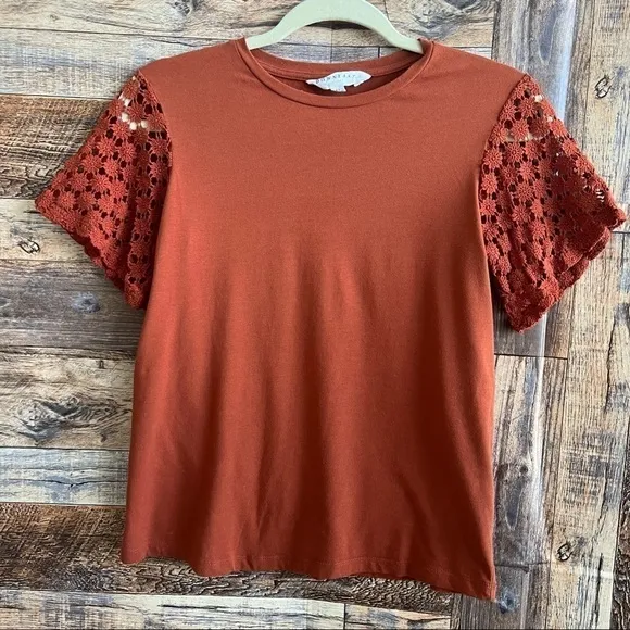 NEW WITHOUT TAG! DownEast crochet burnt Orange short sleeve tee shirts top SIZE: XSMALL Casual crochet sleeves 00130 Short sleeves Casual top Crew neck Approximate measurements : CHEST: 18.5” LENGTH: 22.5” Bohemian boho embroided crochet lace