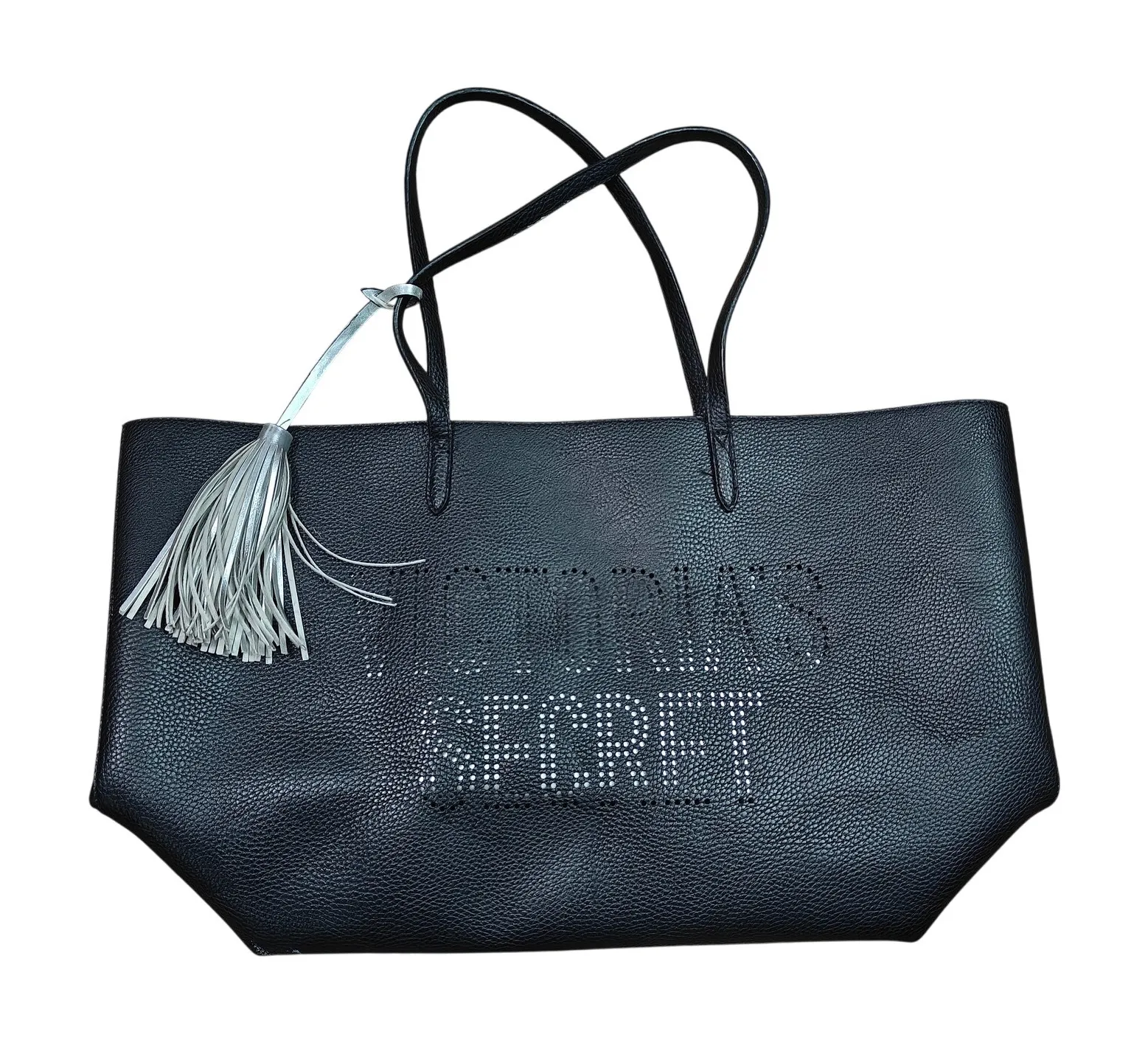 Victoria Secret Tote Bag Tassel Extra Large Weekend Bag -Black -Silver Accents - Laser-Cut Logo -T... Show more