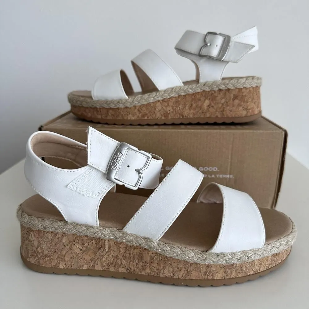 Dr. Scholls Shoes Womens 9.5 Ellie Platform Sandals Wedge Ankle Strap Espadrille Condition: Brand New includes original box and packing tissue Features white synthetic leather upper with three straps and side adjustable silver buckle closure Jute espadrille-style braided trim along edge of platform midsole for a casual summer look Open toe and open heel design for breathable comfort US Size 9.5 Medium (M), UK Size 7, EU Size 40.5, 25.8 cm length Style name: Ellie, Model number: D9098S2100 Original box included (minor box wear visible)