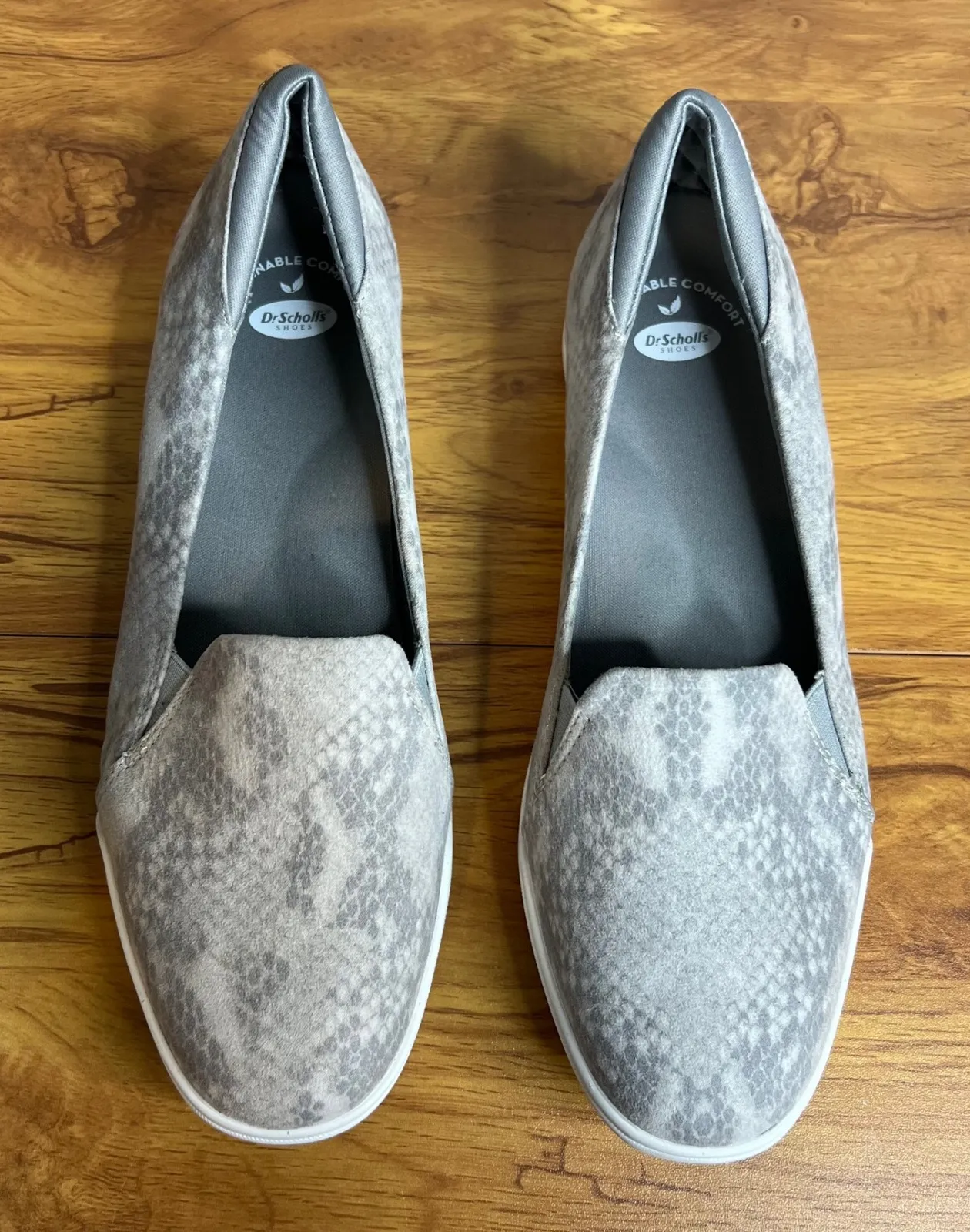 Dr Scholls gray slip on flats with a chic snake print. These comfortable shoes offer a stylish and v... Show more