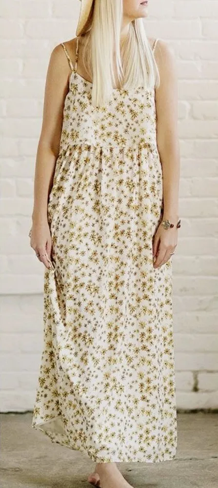 dRA Los Angeles x Kelli Murray floral maxi dress in white and yellow daisy print. Flowy, boho-beachy silhouette with strappy back. Made in USA. This dRA Los Angeles x Kelli Murray floral maxi dress captures effortless bohemian charm with its breezy fit and delicate daisy print. Pair with a straw hat and sandals for a cottagecore picnic, brunch, or beach day. Layer with a denim jacket or cardigan for effortless spring-to-fall styling. Off-white with mustard-yellow floral print. Double spaghetti straps. Cross-back detail. Bodice overlay with elastic waist. Long, flowy maxi length. Care & materials tag cut out. Great preowned condition. BRAND: dRA Los Angeles x Kelli Murray SIZE: XS COLOR: Off-white, mustard yellow PIT TO PIT: 17” WAIST: 16” HIPS: 24” LENGTH: 53” CONDITION: previously owned ORIGIN: USA Marked sizes will vary by designer • All measurements are approximate and taken flat in inches • Color may vary on your screen. •Fast Shipping •Small Business •Carefully Packaged, Smoke-Free •5-Star Seller dRA Los Angeles, Kelli Murray, floral maxi dress, boho summer dress, cottagecore style, festival outfit, daisy print, made in USA, beach vacation, sundress