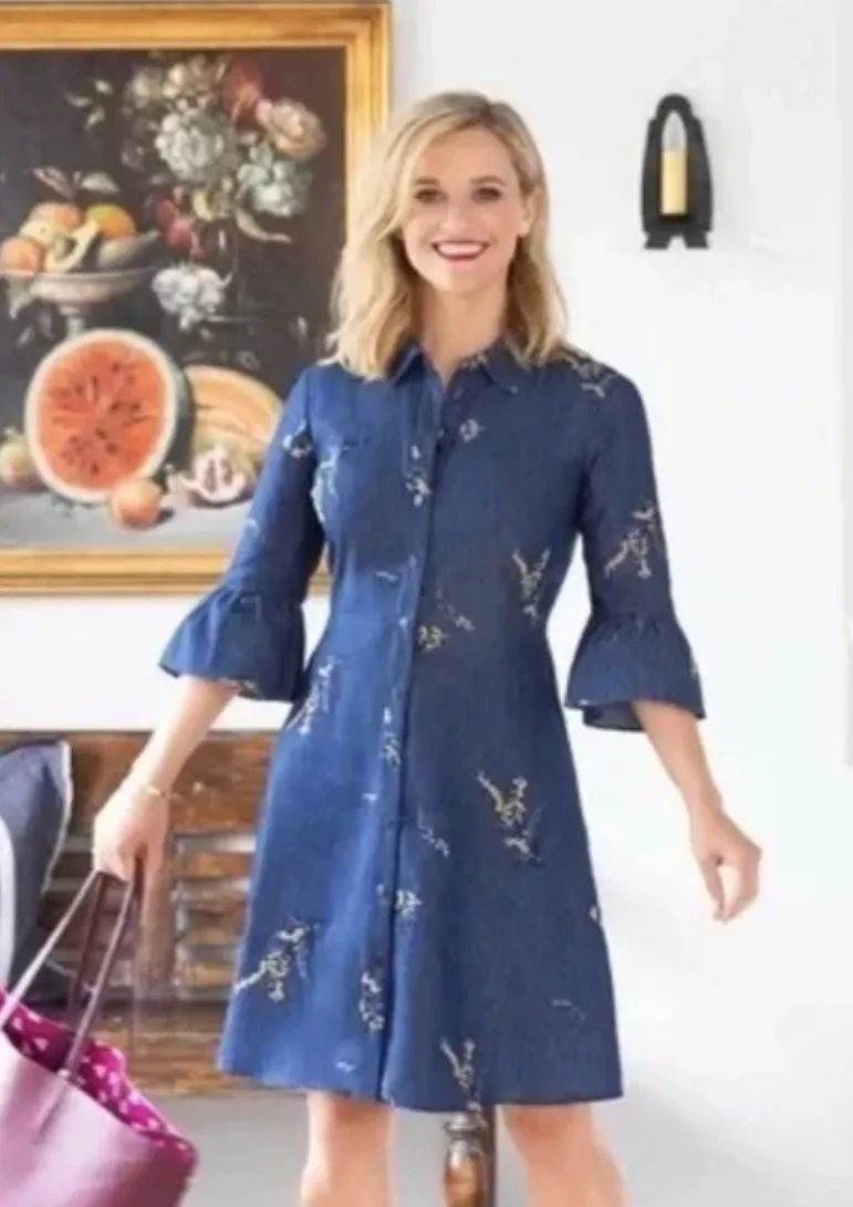 Draper James 100% Cotton Floral Embroidered Blue Chambray Denim Knee-Length Bell Sleeve Button-up Sh... Show more