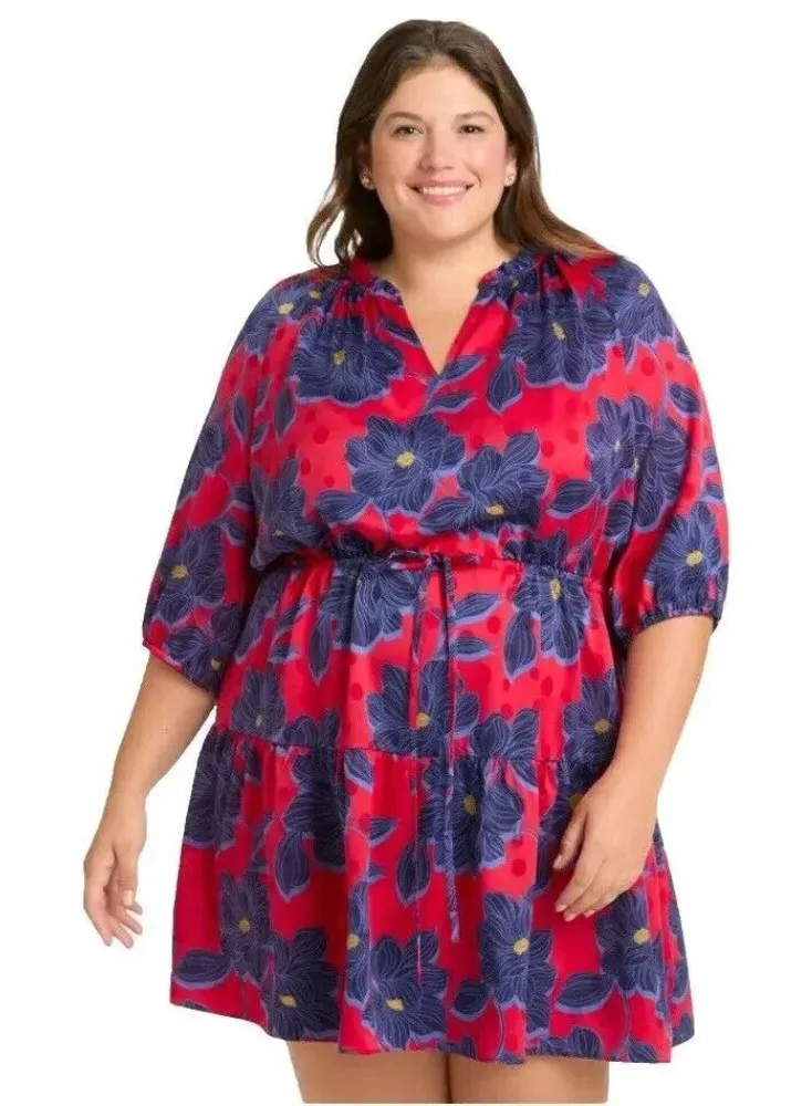Look stylish and elegant in this Draper James Martina Mini Dress, perfect for any occasion. The dress features a beautiful Magnolia Jacquard Dot pattern with red floral accents, making it a great addition to your wardrobe. The 3/4 sleeve and V-neckline add a touch of sophistication, while the tiered style and midi length provide a playful and feminine touch. Made of 100% polyester, this dress is machine washable and easy to care for. It comes in a plus size XXL and is suitable for travel, Holy Communion, parties, cocktail events, casual outings, workwear, and business settings. The dress is a perfect blend of flower and cruise themes, making it a great choice for any season.