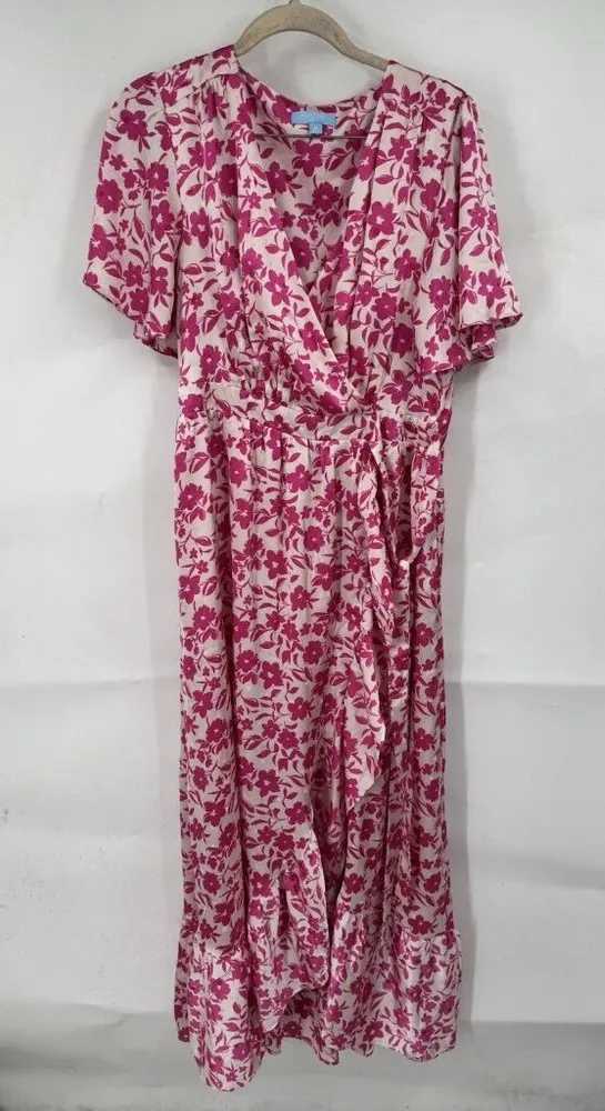 Excellent pre owned condition. Has modesty clasp on neckline. Size medium. Flowy. Faux wrap look. Elastic waist band in the back to help with fit. All measurements are approximate: 18 inches pit to pit. 28 inch waist. 55 inch length from shoulder to bottom hem. E28