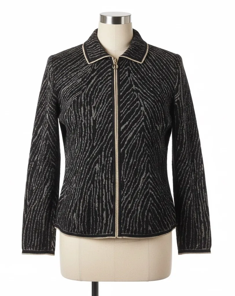 Type: Sweater Material: Rayon, Nylon, Polyester, Metallic Theme: Zebra Accents: Zipper Features: Full Zip, Stretch Fabric Type: Knit Pattern: Animal Print Season: Spring, Fall, Winter Closure: Zip Occasion: Casual, Office, Party Draper's & Damon's, cardigan, zip-up, full zip, black, gold, metallic, shimmer, sparkle, glam, luxe, chic, zig-zag, wave pattern, swirl, textured, holiday, Christmas, New Year's Eve, party, evening, formal, cruise, career, professional, statement, size L, knit, elegant, vintage Measurements are Approximate: Length 28" Armpit to Armpit 19" New with Tag. Please see photos for measurements, condition and details. Please Verify Measurements. (7793)
