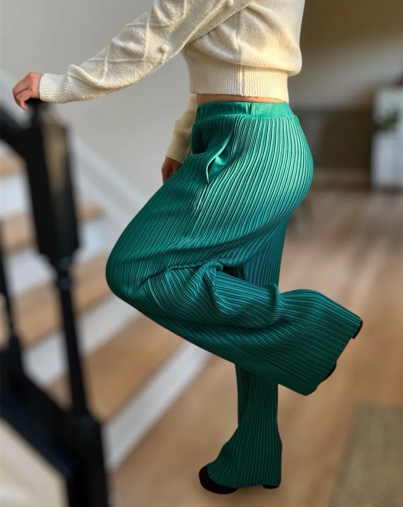 Gently used Draper’s and Damon’s pretty pleat pants. High-waisted and stretchy with pockets. Relaxed fit, flowy and comfortable. Festive green color for holiday parties or a pop of color at the office. Approximate measurements: Inseam: 30” Outseam: 40.5” Front rise: 12” Back rise: 13” Waist: 13” unstretched, 16” stretched