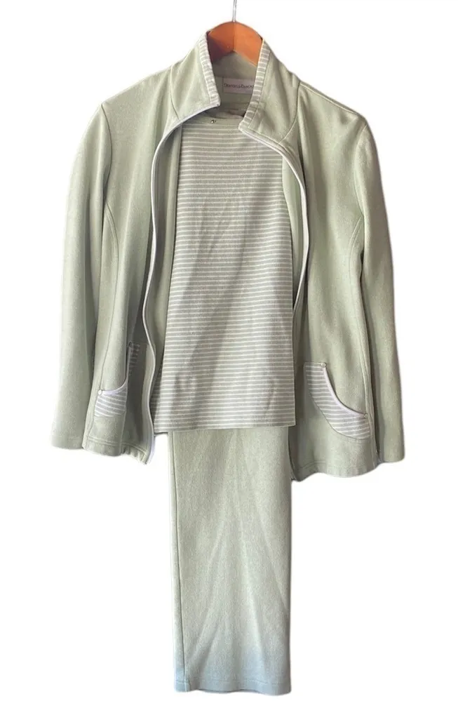 Drawers & Damon Sage green cotton blend lounge set Fall Athleisure Loungewear 3 piece lounge wear set . mostly cotton but blended w/ other fabrics for a stretch quality to the fabric . the top is striped with silver details in the collar . pockets in both the pants and jacket . Fall Winter lounge set sweat suit leisure suit coastsl grandma