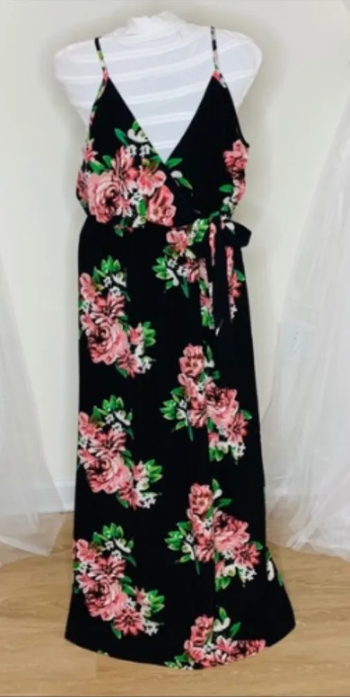 This Dream of Me Black Floral Spaghetti Strap V Neck Slit Stretch Waist Maxi Dress in size L is a st... Show more