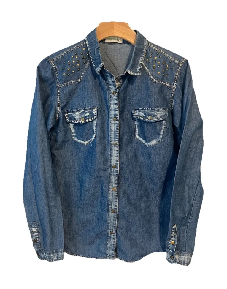 In fantastic preowned condition. There are no issues or flaws. Top of shoulder to bottom hem measurement is approximately 26 inches. Armpit to armpit measurement is approximately 18 inches. The Dream Out Loud Button Down Jean Shirt is a stylish and trendy top for women in size Large. Made from a blend of polyester and cotton, this denim shirt features rhinestone snaps on the front and convenient pockets on the side. The collared neckline and button closure make it suitable for casual occasions, while the solid blue color adds a pop of vibrancy to your wardrobe. The long sleeves and regular fit provide comfort and style, making it a versatile addition to any woman's closet. Item9956