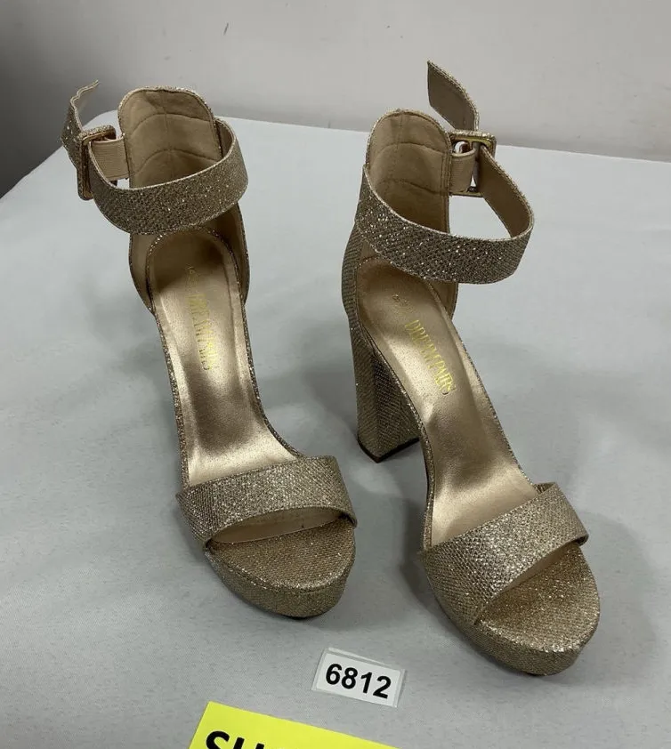 These Dream Pairs strappy platform sandals are the perfect addition to any woman's wardrobe. The size US 8 (EUR 39, UK 6) gold glitter sandals feature a 5” stacked heel making them a stylish and comfortable option for any occasion. The man-made upper material and glitter accents add a touch of glamour, while the strappy design adds a trendy element to any outfit. Perfect for adding a touch of sparkle to your look, these sandals are a must-have for any fashion-forward woman. They have an ankle strap buckle closure and an open toe. These sandals are pre owned and look to be in excellent condition!