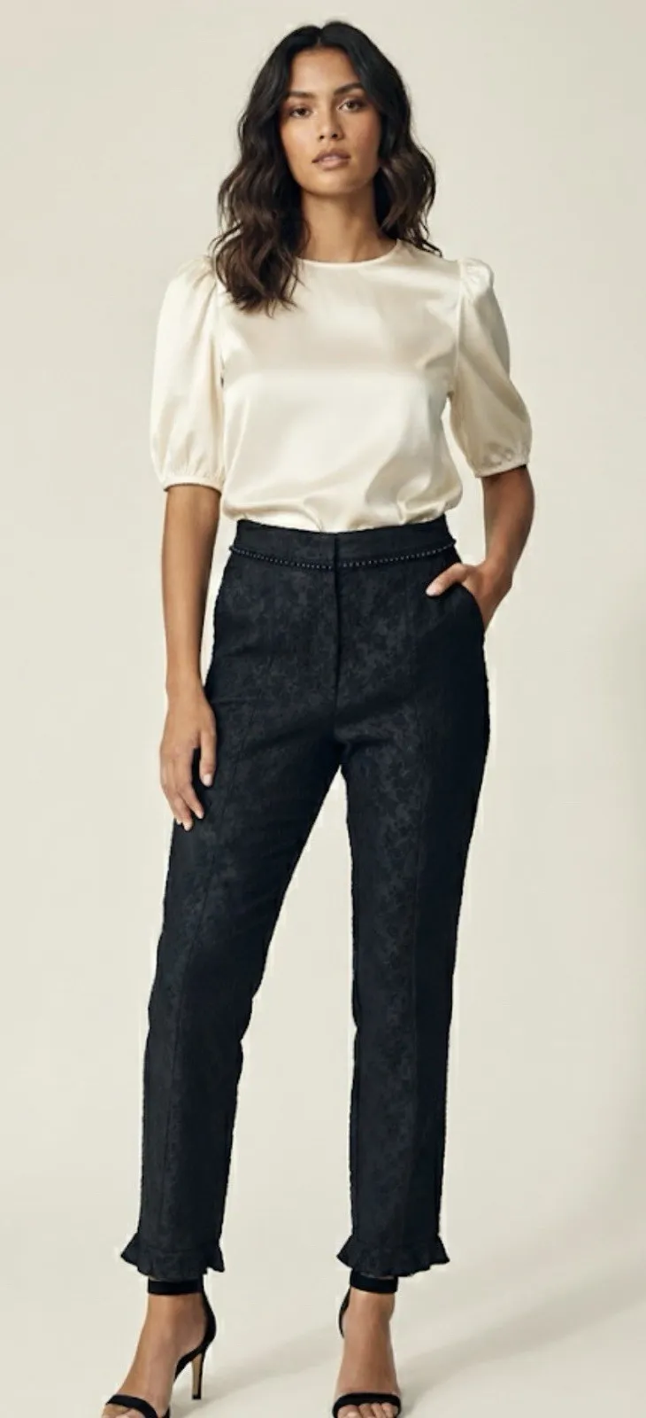 These are a stunning pair of high-waisted trousers from the premium DREAM Sister Jane collection. Perfect for a holiday party, special event, or simply elevating your everyday style. The black fabric features a beautiful, subtle floral jacquard weave, giving them a rich texture and dimension. The straight-leg cut is flattering and versatile. Unique Details: • Beaded Waistband: The fitted high-waist is trimmed with an elegant row of black beading, eliminating the need for a belt. • Ruffled Hem: The cropped or ankle-length hem is finished with a delicate, raw-edge ruffle/frill for a touch of signature Sister Jane whimsy. Measurements: Waist 13.5 Rise 11.5 Inseam 28 Leg opening 7.5