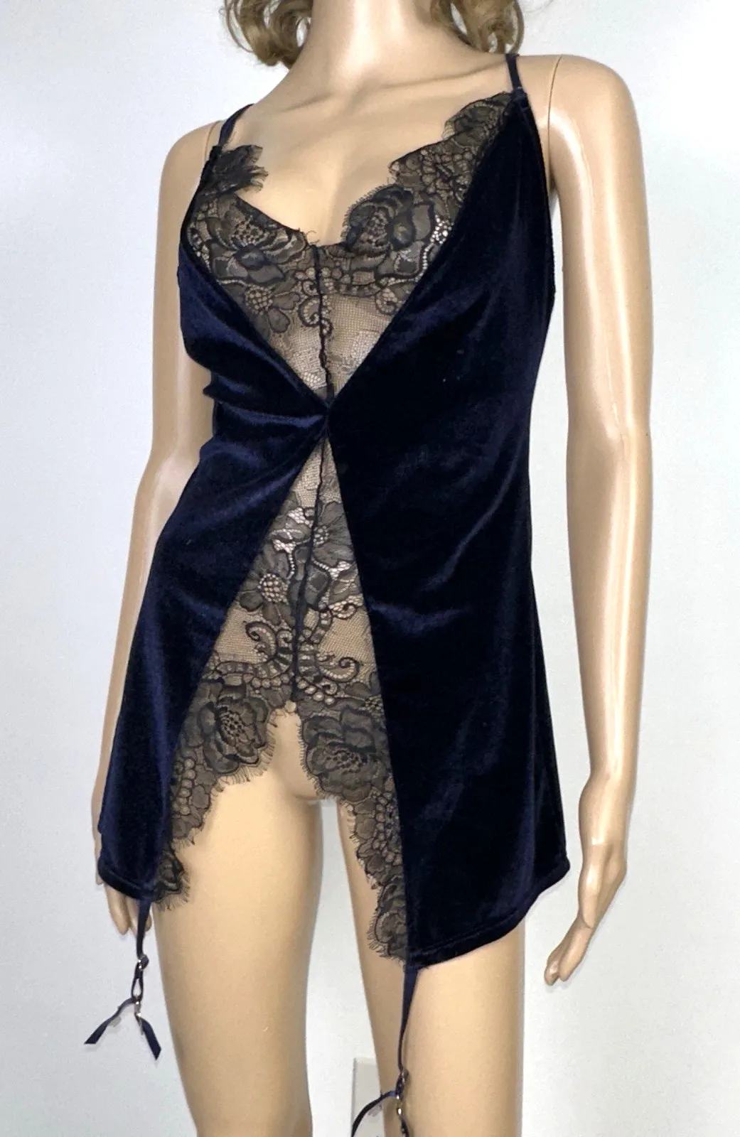 Listed is a Dreamgirl Stretch velvet garter slip with eyelash lace insets featuring: Gold hardware accents, Angled hem with attached/adjustable garters, Low back with adjustable, double criss-cross shoulder straps. Size XL. Dark blue velvet, black lace. Excellent preowned condition. Chemise only. Lying flat, across waist unstretched: 15.5", about 19" stretched About 28" as adjusted shoulder to bottom.