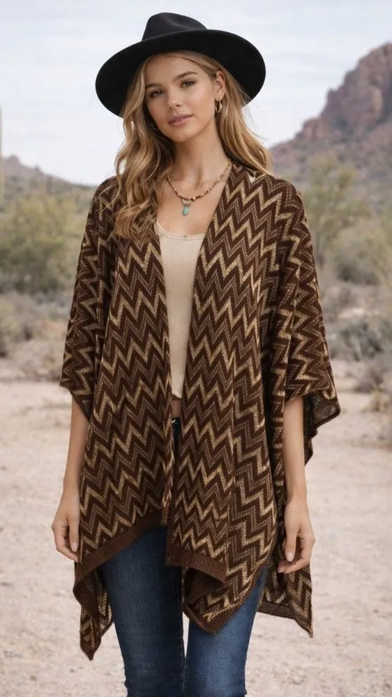 This Dress Barn chevron metallic poncho wrap is a standout layering piece with rich chocolate brown... Show more