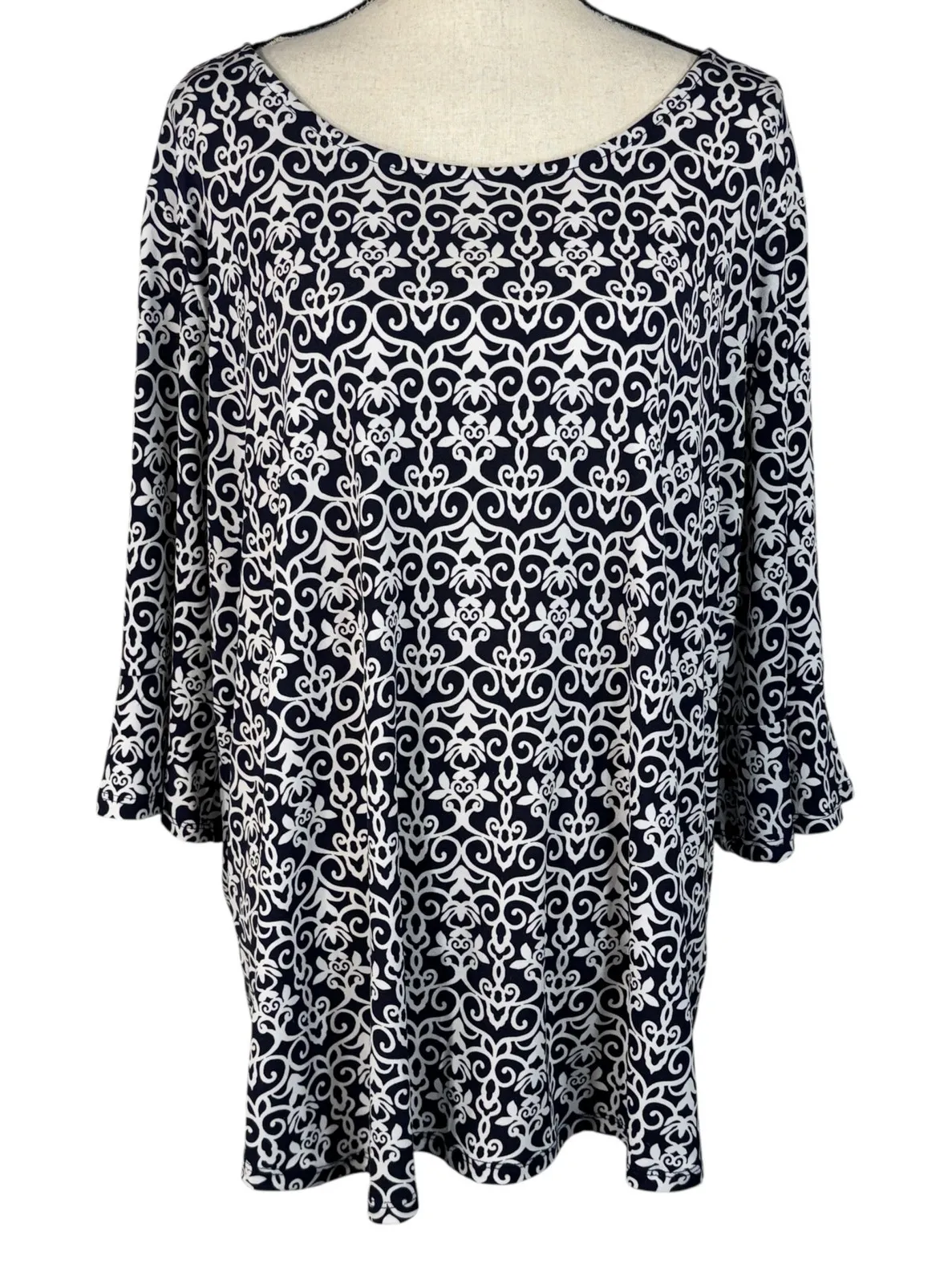 Dressbarn 3X-Large Top * Geometric * Stretch * 3/4 Bell Sleeves * Boat Neck * Rear Zipper * Navy B... Show more