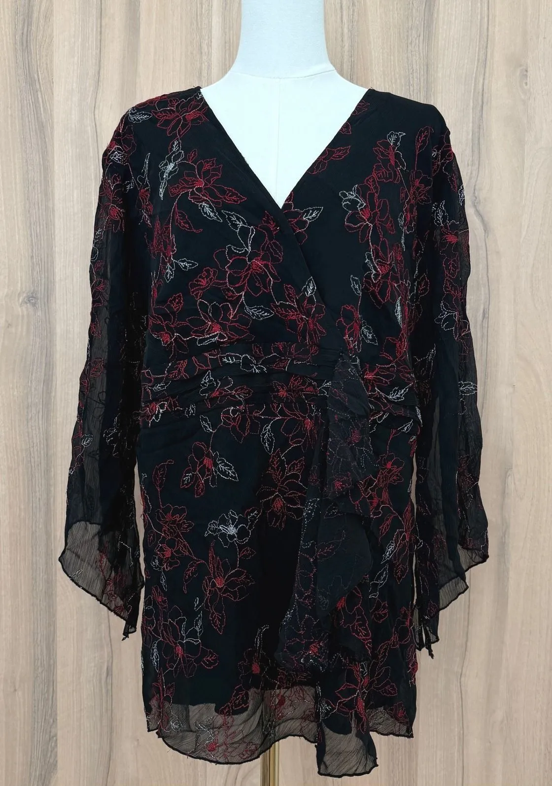 Sheer black floral wrap blouse with red embroidery, bell sleeves, and a tie waist. Lightweight and f... Show more
