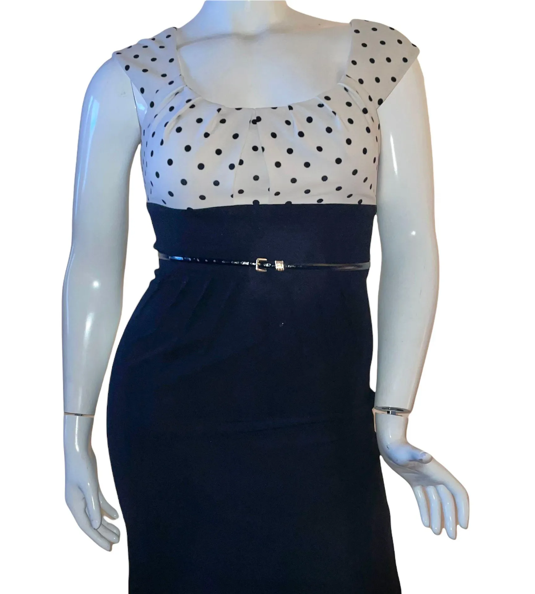 Off white with black polka dots upper. Black Bottom. Belted. Pleated collar. Short capped sleeves. Z... Show more