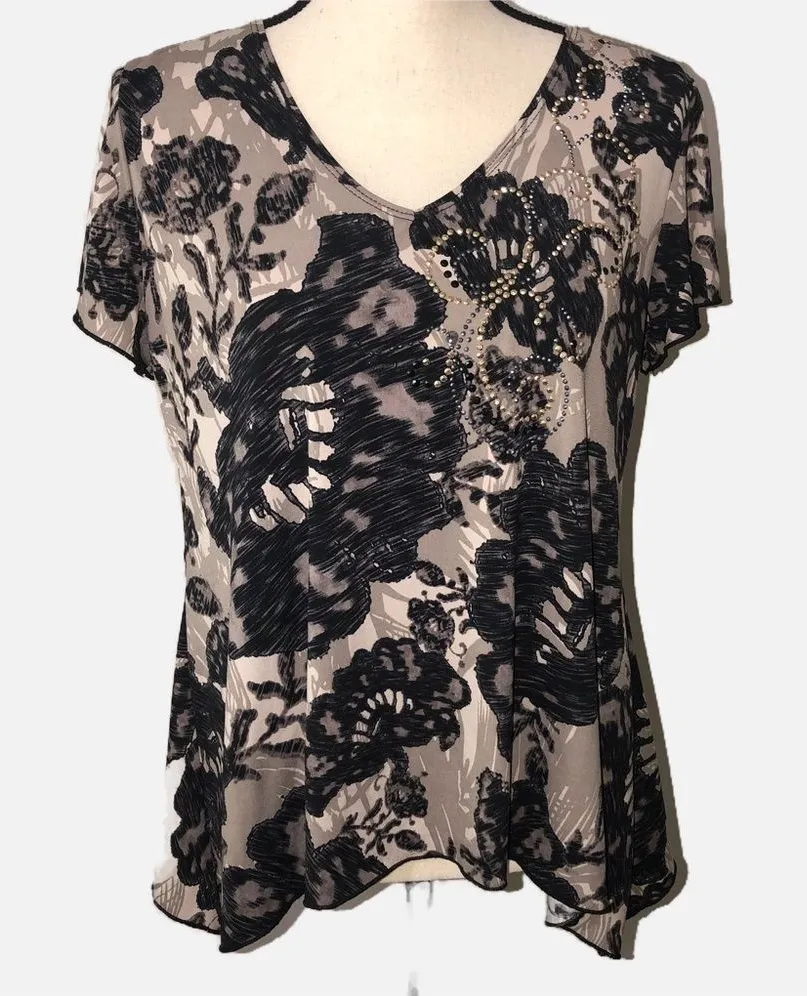 Good pre-loved condition size medium neutral tones black taupe beige print with metallic stuff accen... Show more