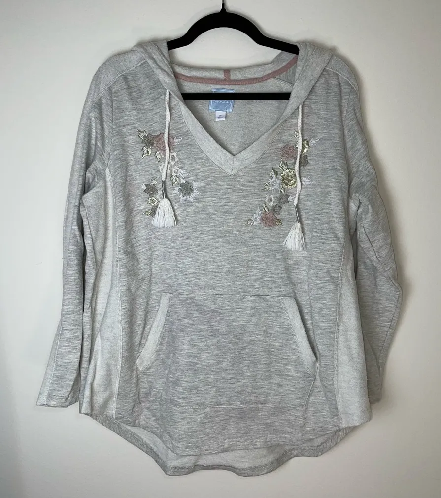 V neckline Drawstring hood with metallic accents and tassels Long sleeves Round hem Kangaroo po... Show more