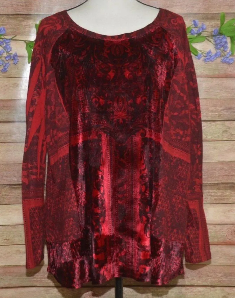 This dark red pullover blouse by Dressbarn features a velvet front and back design with long sleeves... Show more