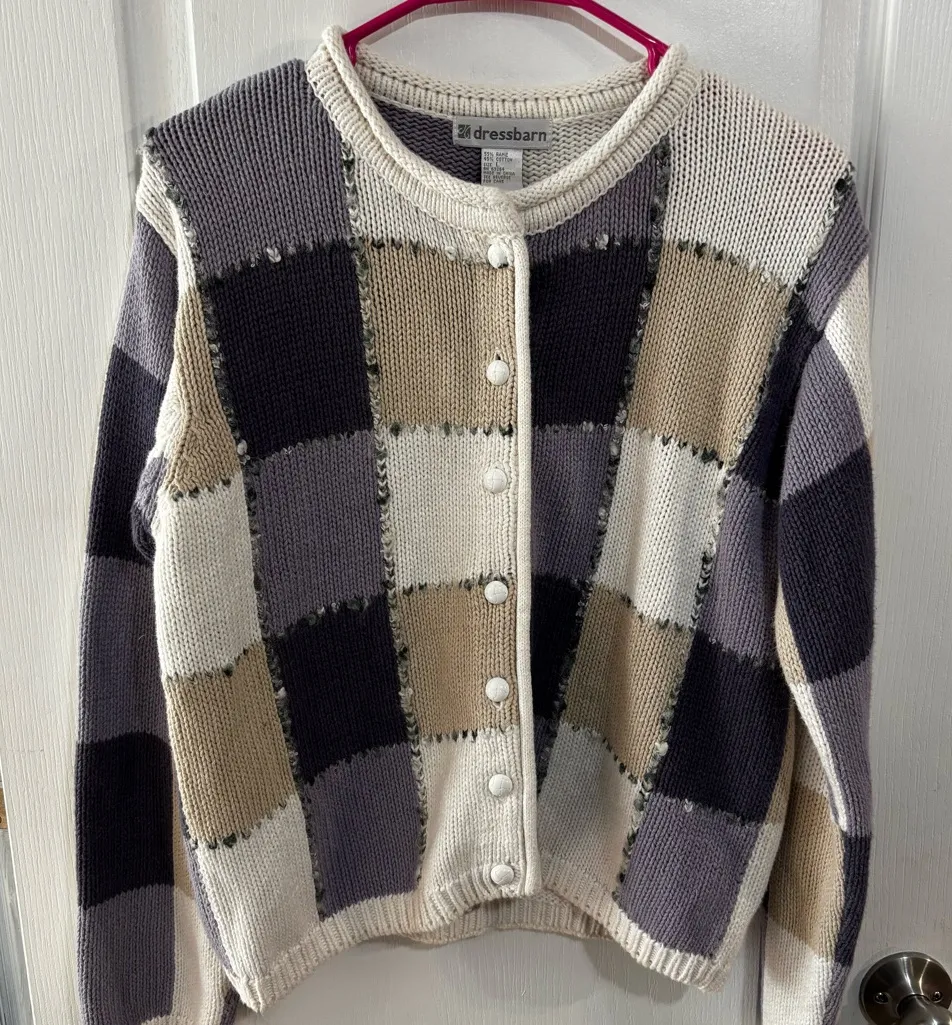 Chic plaid cardigan by Dressbarn. Features cream, gray, and tan blocks. Perfect for layering. 20” P... Show more