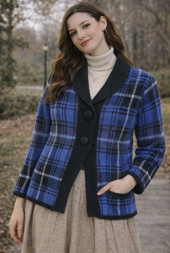 Vintage Dressbarn chunky button-front cardigan sweater featuring a bold black and blue plaid pattern... Show more