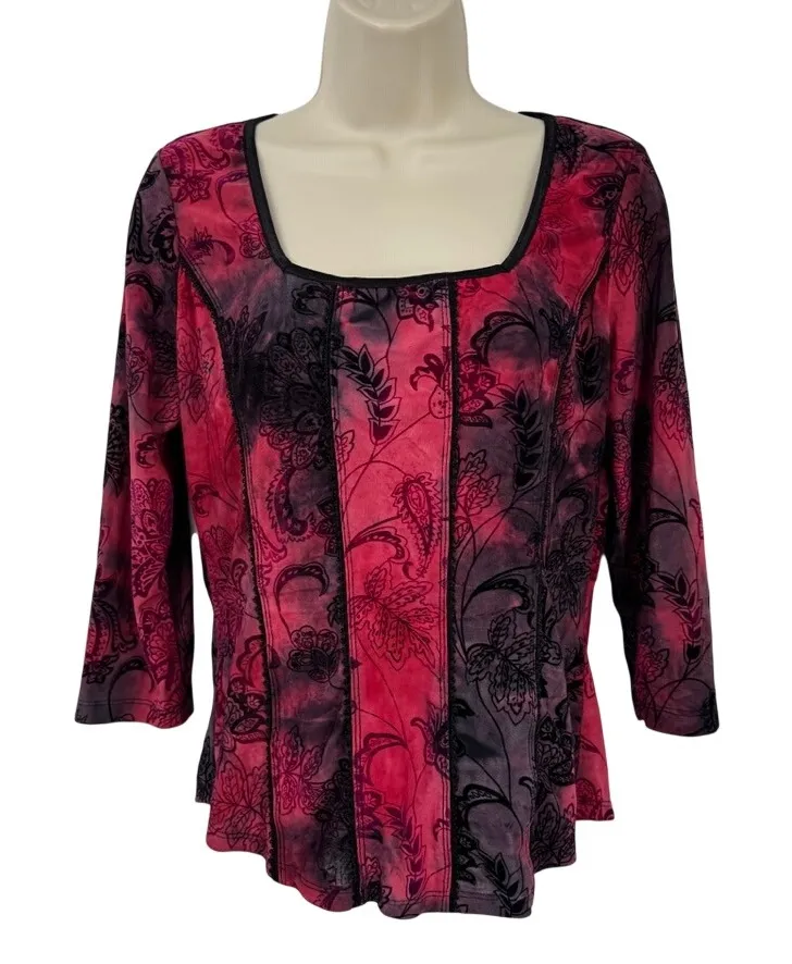 Unleash vibrant energy with this stunning Dressbarn top, a captivating fusion of bold pink and deep black. The eye-catching floral paisley print, rendered in a mesmerizing tie-dye effect, cascades across the fabric, creating a visually dynamic masterpiece. Paneled construction with delicate black lace trim adds a touch of artisanal charm, while the flattering square neckline and 3/4 sleeves offer a sophisticated silhouette. This piece is perfect for adding a touch of artistic flair to your everyday wardrobe or for making a statement at a casual brunch or a weekend getaway.