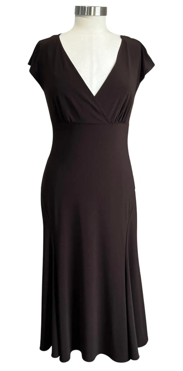 DressBarn slinky stretch midi dress in a rich chocolate brown. Features a flattering V-neckline, cap... Show more