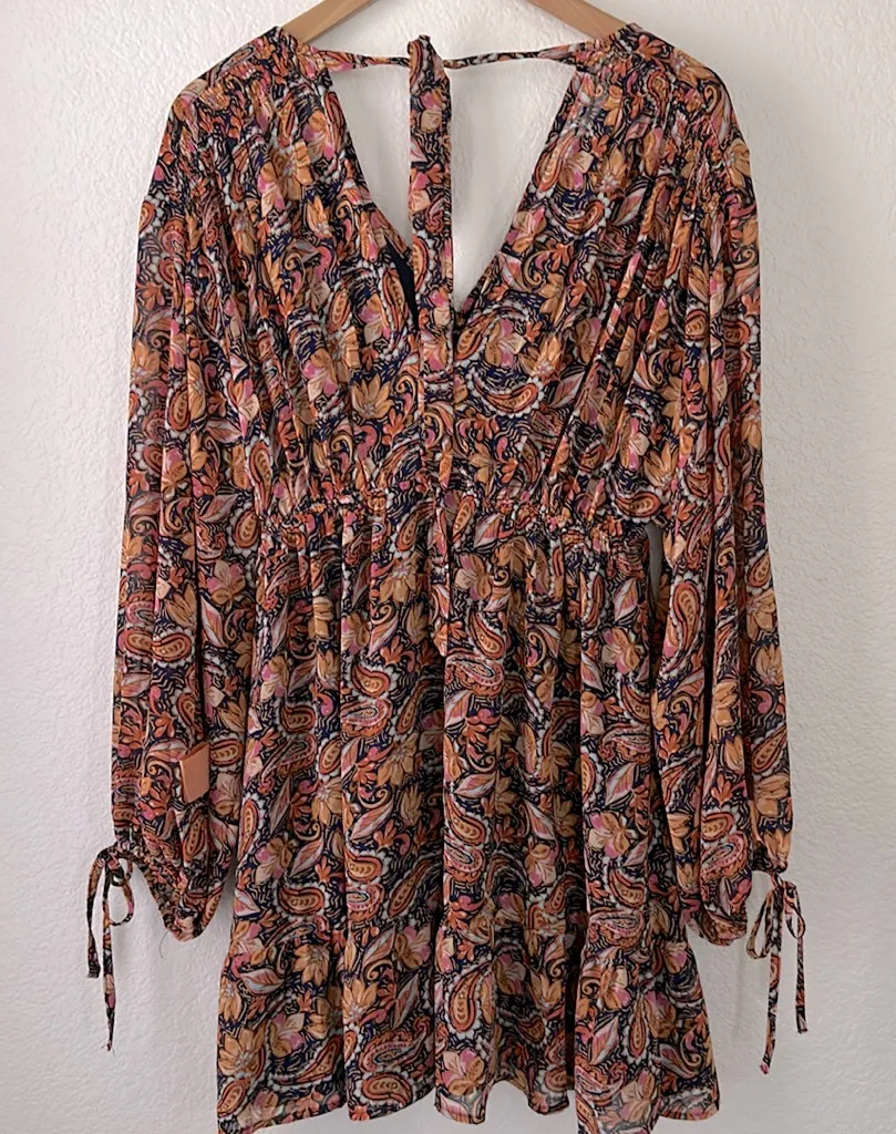 Flowy bohemian dress with a vibrant paisley print. Features long sleeves and a tie-back design. Perfect for casual outings. Size Small Tie back/hidden zipper closure 2 front hooks 15” across underarms 34” in length 21” sleeves length x 11”width