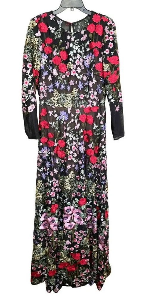 Questions? Leave a comment below! Dress the Population Ava gown, Size XL, Pit to pit: 19.5” Waist: 16” Length: 65.5” Round neck, long sleeves, Back zipper closure 100% polyester Stretchy mesh overlay Comes with inner attached slip Hand wash