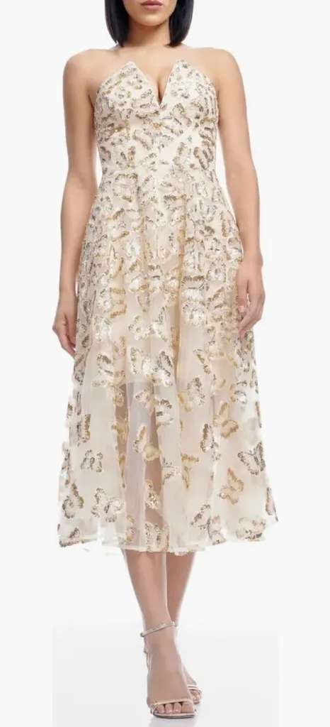 Dress the Population Briella Sequin Butterfly Strapless Dress champagne size XL. New with tags. Available at Nordstrom at full price. Willing to negotiate on reasonable offers. Chic midi dress with butterfly embroidery. Features gold and cream tones.