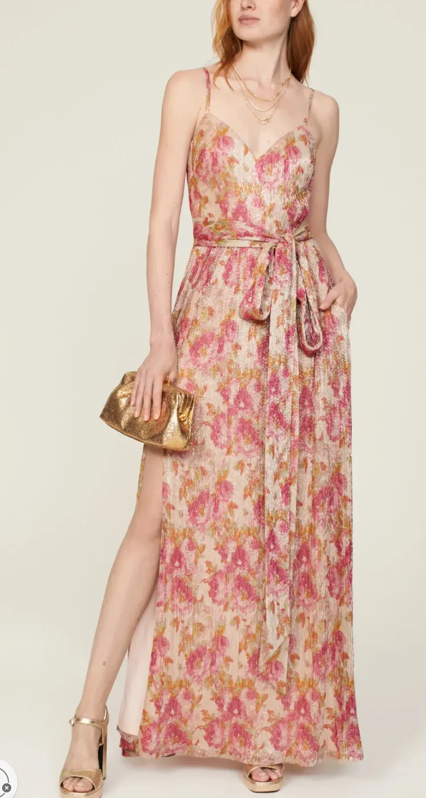 Beautiful designer sleeveless gown goddess vibes with a tie waist and v-neck neckline, pockts, full skirt in a gorgeous gold pink floral metallic plisse fabric. Repaired flaw see details below. perfect for special occasions, formals, formal wedding, holiday parties, black tie, red carpet, fall wedding, christmas, new years, galas Gold pink floral plisse (55% Polyester 45% Metallic). Lined Back zipper closure Dry Clean recommended Size XS Length ~58" Armpit to Armpit ~17" (runs tight in the bodice) Please Note: There were a couple of tiny tears fabric near the side hem that are repaired and the area near the top of the slit needed to be re-enforced - see last 2photo - reflected in the price - otherwise Excellent Condition Retail $268