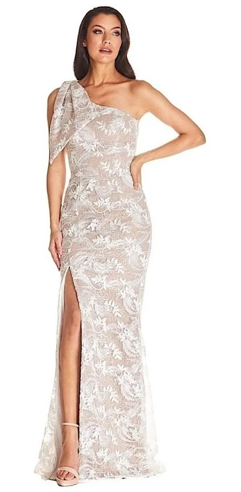 Dress The Population Genevieve Lace Maxi Trumpet Gown One Shoulder Bow White Medium. Medium = 8-10.... Show more