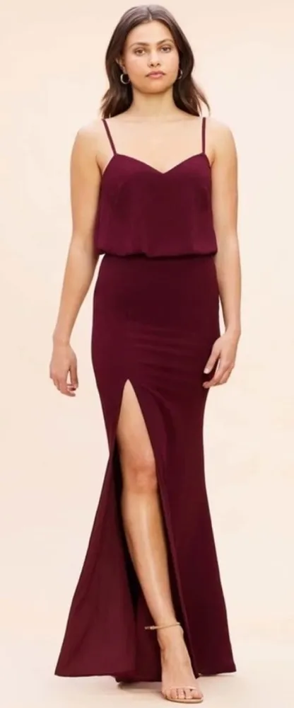Dress the Population Gracelyn Blouson Jersey Maxi Gown Thigh High Slit Burgundy L. Large = 10-12. A touch of sophistication, and a touch of sexy our Gracelyn dress in Burgundy has it all. She features both graceful drape, a high waist silhouette, and finishes with an always alluring thigh-high slit in the gently flared floor sweeping skirt. Adjustable straps. Back center zip. Approx measurements: 18.5“ pit to pit, 14.5“ waist, & 61.5“ length. New condition. No stains/flaws. Smoke/pet free home. Offers welcome. Bundle & save. Ship same/next day. Packaged w/ care.
