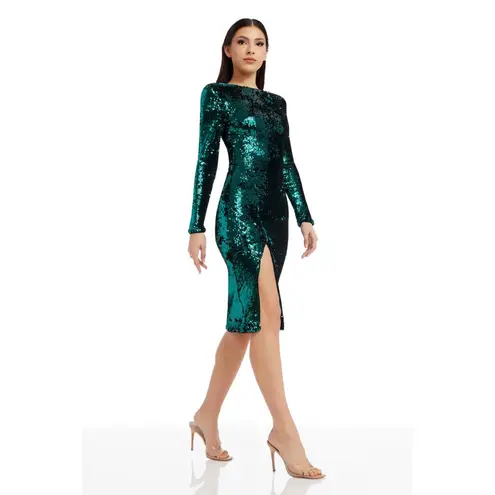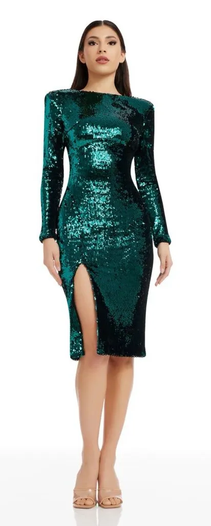 . This stunning sequin midi dress shines in any room. This knee-length dress features a round neck and a front slit. It has maximum stretch and is fully lined in our knit lining. * New with tags! * Long sleeve * Built in shoulder pads * Back zipper * Shell: 100% polyester * Lining: 95% polyester, 5% spandex * Hand wash
