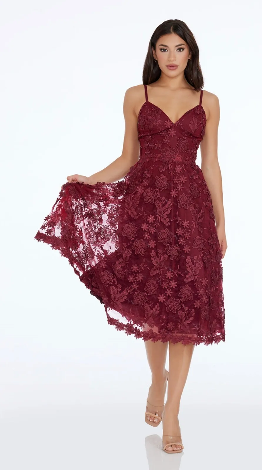 Excellent Condition, No Callouts Size: Medium Color: Burgundy The Tahani Dress has an all-over floral embroidery design on non-stretch tulle, featuring a sweetheart neckline and adjustable straps. The hemline is finished with a floral trim, giving an extra feminine touch. This fit and flare style dress is perfect for a warm summer night or even a special occasion.