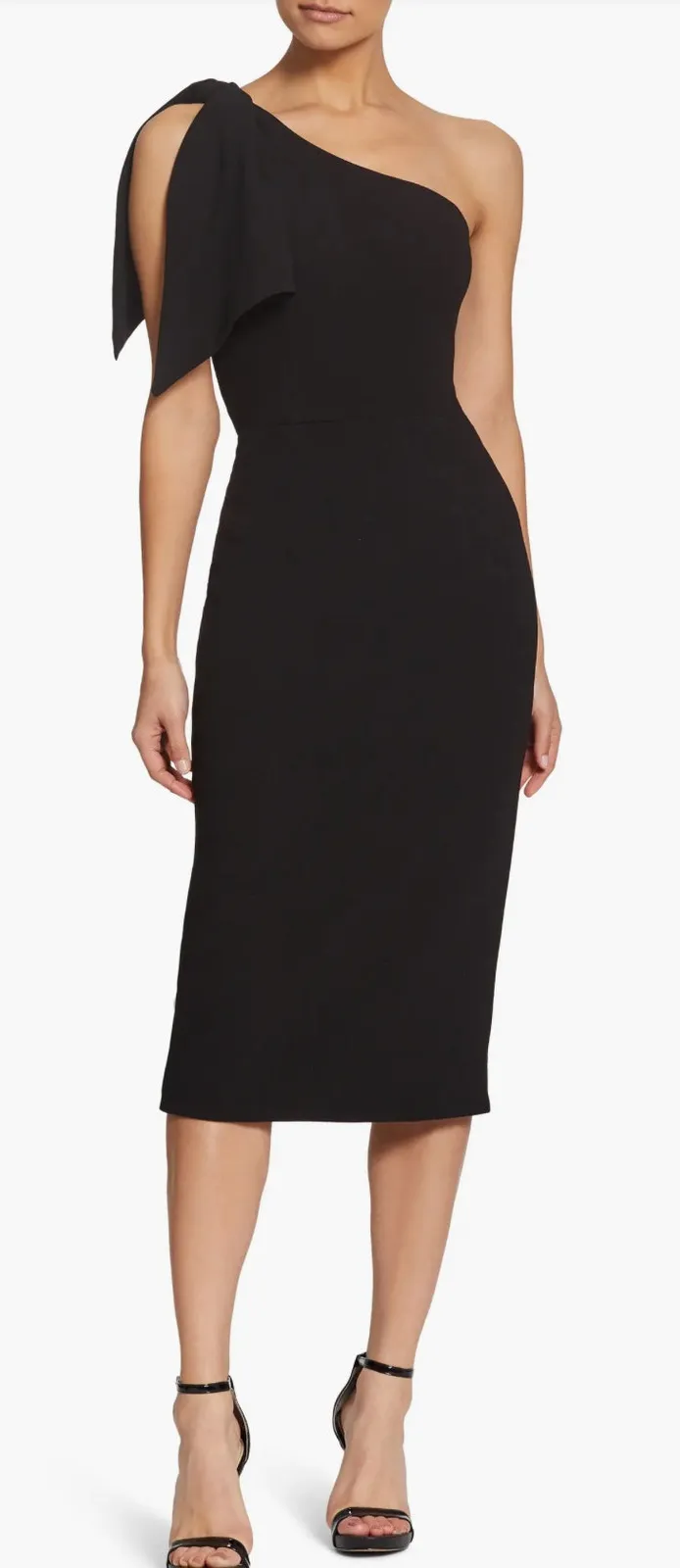 NWOT DRESS THE POPULATION Tiffany One-Shoulder Midi Dress in Black. Size Extra small. Body-conscious fit; for a more relaxed fit, order one size up. An elegant one-shoulder neckline and figure-hugging silhouette style a sophisticated midi dress with two panels that cascade over the single shoulder. 43" length One-shoulder neck Sleeveless Lined 97% polyester, 3% spandex Dry clean or machine wash, line dry Imported Item #5699081