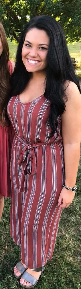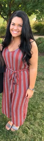 Striped jumpsuit from dress up! TINY TINY hole in the back which is covered up by the wrap belt.