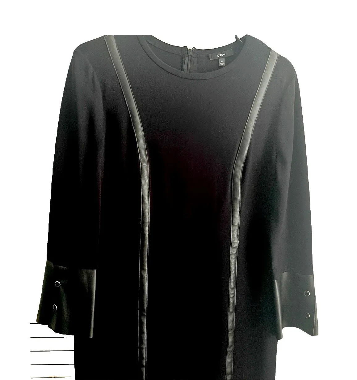 - Sleek black bodycon dress by Drew has vegan leather trim running down the front and at the cuffs - Modern & edgy witchy/whimsigoth vibe - Medium weight knit with some stretch; unlined, long zipper closure down back (shown in pics) - Crew neckline, long sleeves with faux leather bell cuffs and snap detail; hits around knee-length depending on height - Great for concerts or date nights, dressed up with tights and boots for a moody goth/alt look, and could still pass for work-to-evening professional Gently preowned, no visible flaws noted, zip still very smooth; please see all photos for condition and details FLAT LAY MEASUREMENTS Width, pit-to-pit: 17" Width, across shoulders/back: 15-16" Length, from shoulder: 33" Sleeve length, from shoulder: 21" *Pics of most measurements also in photos - Ships next business day - Pet-friendly, smoke-free home