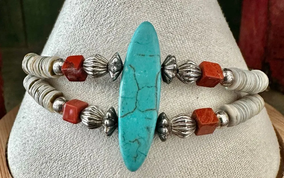Beautiful artisan-made Southwestern-style bracelet featuring a striking oval dyed howlite stone, cube-cut coral beads, natural shell heishi, and silver-tone accent beads. The combination of vibrant turquoise blue and warm coral creates that classic desert-sunset look—earthy, bold, and easy to style. Styling tip: Perfect with denim, linen, or anything boho. Try stacking with other silver or turquoise pieces for a layered Southwestern vibe. 💎 Materials: dyed howlite, sponge coral, natural shell, silver-tone metal 📦 Condition: Excellent vintage-style condition with light patina on metal beads ✨ Same or next day shipping & packed with care Bundle to save! Free gift with a purchase of 3 or more items Photos are part of the description. Reasonable offers welcome! #southwesternstyle #bohojewelry #turquoisevibes #coralbracelet #shelljewelry #howlitebracelet #artisanjewelry #bohochic