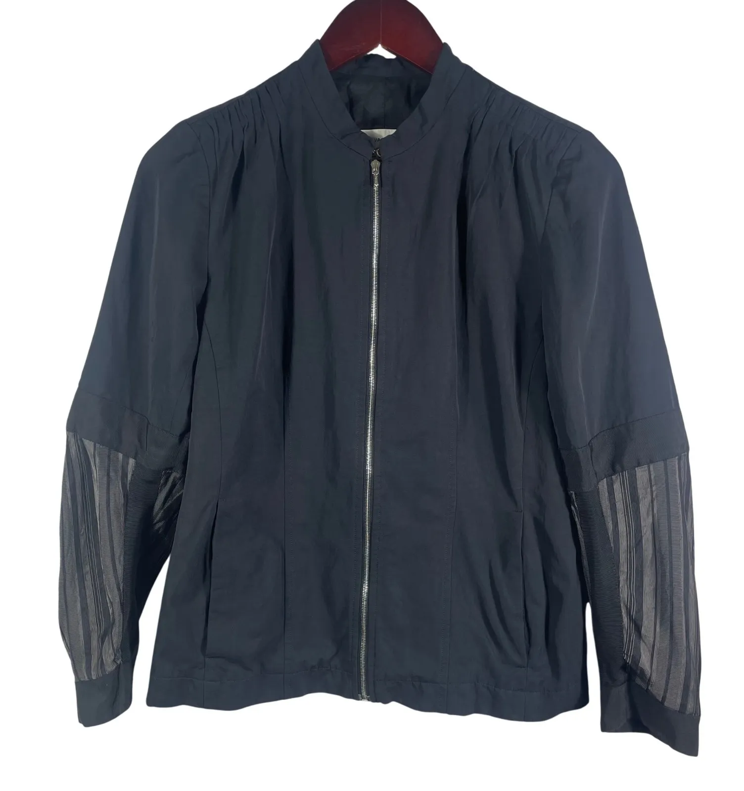 Elegant and avant-garde Dries Van Noten lightweight jacket featuring sheer pleated panels on the sleeves and a zip front closure. Expertly crafted in Belgium from a soft rayon-cotton blend, this piece embodies the refined minimalism and architectural tailoring that define the designer's signature style. • Size: 38 (approx. US 6–8) • Color: Black • Material: 55% Rayon, 45% Cotton • Made in Belgium • Dry clean only • Zip front closure • Sheer pleated sleeve inserts • Structured shoulders with subtle gathers • Mandarin-style collar • Fully lined body Measurements (approximate, laid flat): • Pit to pit: 17" • Length: 23" Condition: In excellent overall condition with two small fabric abrasion on one of the sleeves. Belgian designer, avant-garde fashion, sheer sleeve jacket, luxury minimalist, black rayon cotton blend, Antwerp Six, modern womenswear, runway designer piece
